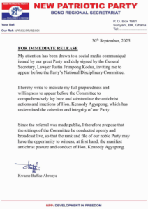 In a statement issued on Tuesday, September 30, 2025, Mr. Abronye disclosed that the invitation was extended by the General Secretary of the party, Lawyer Justin Frimpong Kodua.