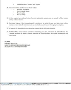 In a related operation, three additional suspects—Abdul Fatawu alias “UN”, Philip Nyarko alias “Kawawa”, and Samak Hadi alias “Toronto”—were arrested for a string of street robberies across Kumasi and surrounding areas. Items recovered include 59 iPhones, six Android phones, four tablets, and five laptops.