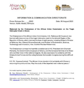 In a statement issued from Addis Ababa, the AU Chairperson extended his heartfelt condolences to President John Dramani Mahama, the Government and people of Ghana, as well as the bereaved families of the victims. He also offered words of comfort to the Ghana Armed Forces and the ruling National Democratic Congress, who are mourning the loss of key national figures.