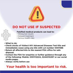 The Food and Drugs Authority (FDA) Ghana has issued a nationwide safety alert after identifying falsified HIV and CD4 test kits circulating in the country. The counterfeit products, labeled as Visitect CD4 Advanced Disease Test Kits, pose serious risks to public health by producing inaccurate results that could delay treatment for patients living with HIV/AIDS.