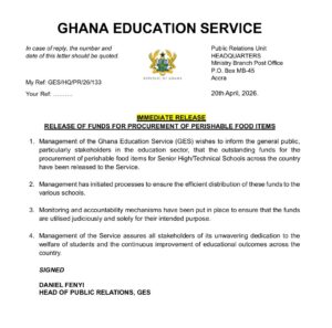 The Ghana Education Service (GES) has announced the release of outstanding funds for the procurement of perishable food items for Senior High and Technical Schools across the country.