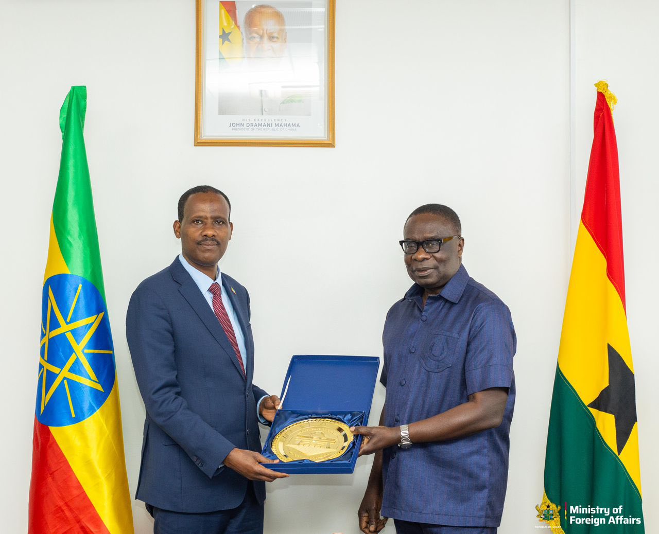 The Deputy Minister for Foreign Affairs, Honourable James Gyakye Quayson (MP), has received His Excellency Teferi Fikir Gosaye for a farewell call following the completion of his tour of duty as Ambassador of the Federal Democratic Republic of Ethiopia to the Republic of Ghana.