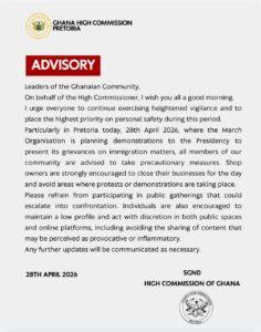The Ghana High Commission in Pretoria has issued a public advisory urging members of the Ghanaian community to exercise heightened vigilance and prioritize personal safety in light of planned demonstrations by the March Organisation.