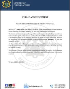 The Ministry of Foreign Affairs has issued a public announcement advising Ghanaians traveling to Senegal to ensure they are medically prepared, following recommendations from Senegalese authorities.