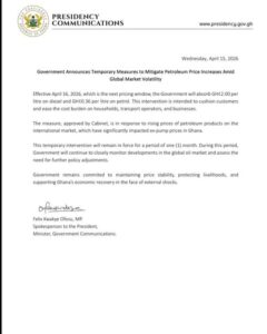Effective Thursday, April 16, 2026, the Government will absorb GH¢2.00 per litre on diesel and GH¢0.36 per litre on petrol. The intervention, approved by Cabinet, is designed to cushion consumers amid global market volatility that has sharply increased ex-pump prices in Ghana.