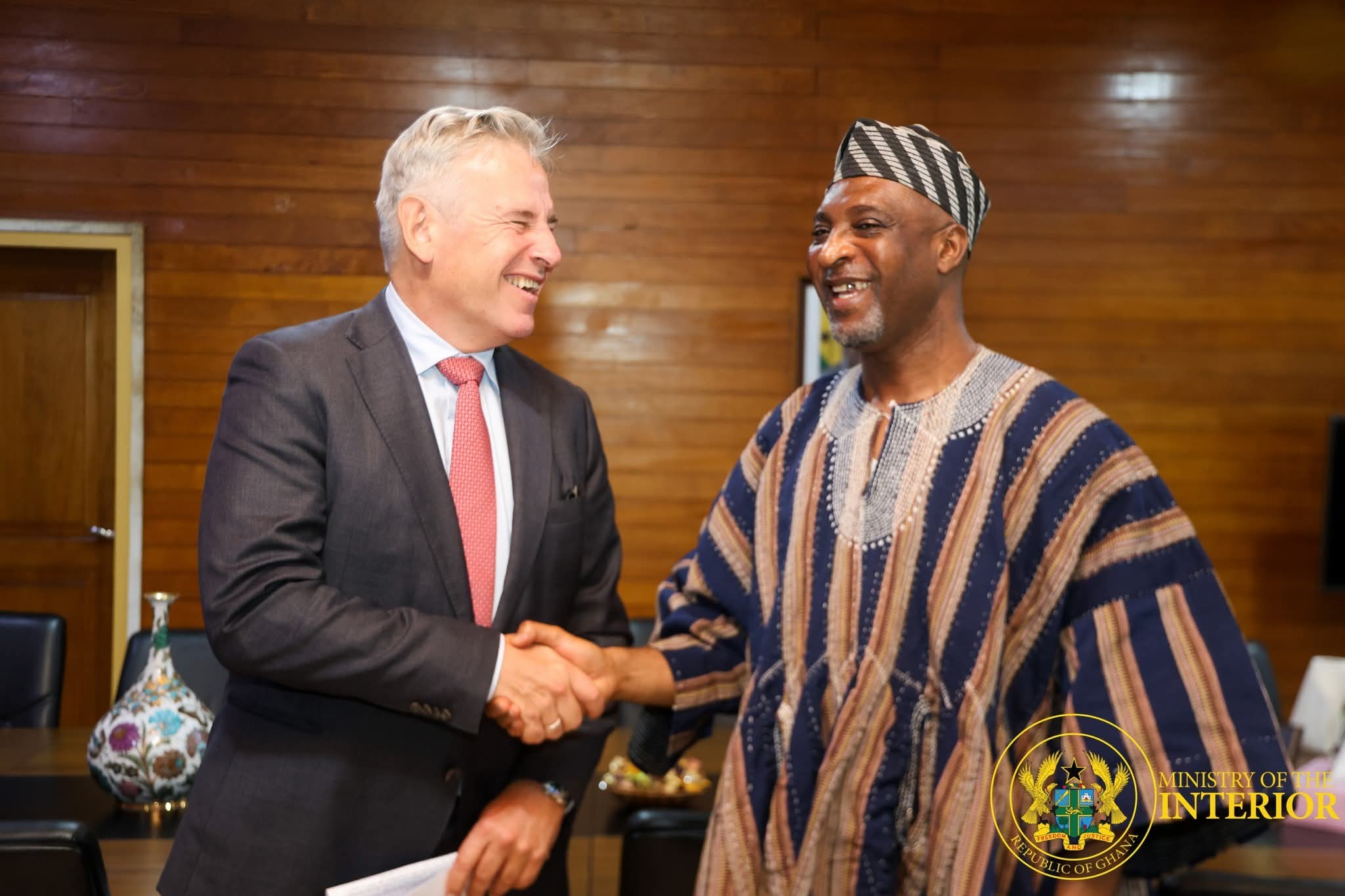 The Minister for the Interior, Hon. Muntaka Mubarak, has officially received the newly appointed European Union Ambassador to Ghana, His Excellency Rune Skinnebach, at his office in Accra. The courtesy call marked a significant step in strengthening diplomatic ties between Ghana and the European Union.
