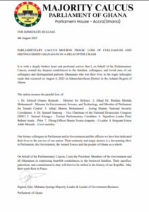 “It is with deeply broken heart and profound sorrow that we, the Majority Caucus in Parliament, extend our deepest condolences to the families, colleagues and loved ones of our colleagues and distinguished patriotic Ghanaians who lost their lives in the tragic helicopter crash that occurred on August 6, 2025,” the statement read.