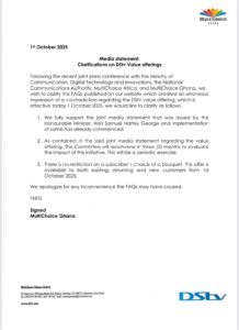 MultiChoice Ghana has issued a statement clarifying details of its new DStv value offering, following what it described as a “misunderstanding” caused by an earlier publication on its website.