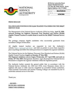 In a statement issued from its headquarters in Accra on April 22, 2026, the Authority said all eligible trained teachers who graduated from accredited Colleges of Education can now access their postings through the NSA website.