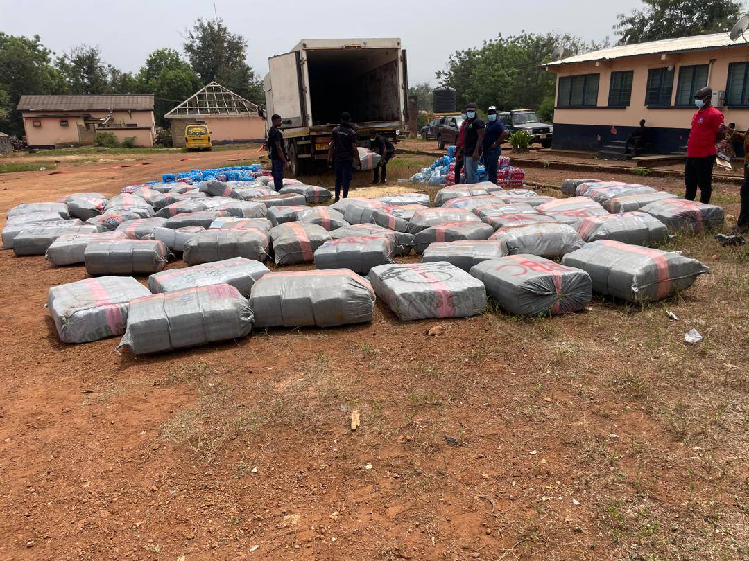 Inside the truck, officers discovered 320 cartons of bottled mineral water concealing 91 bales of suspected cannabis. The haul amounted to 7,173 slabs, with an estimated street value exceeding GHS 1.4 million. The seized exhibits have been retained as investigations continue.