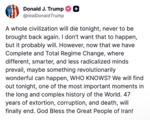 President Donald J. Trump has made a striking statement regarding Iran, suggesting that the nation is on the brink of historic transformation. In a message posted online, Trump declared that “a whole civilization will die tonight, never to be brought back again,” while also expressing hope that new leadership could usher in “something revolutionarily wonderful.”